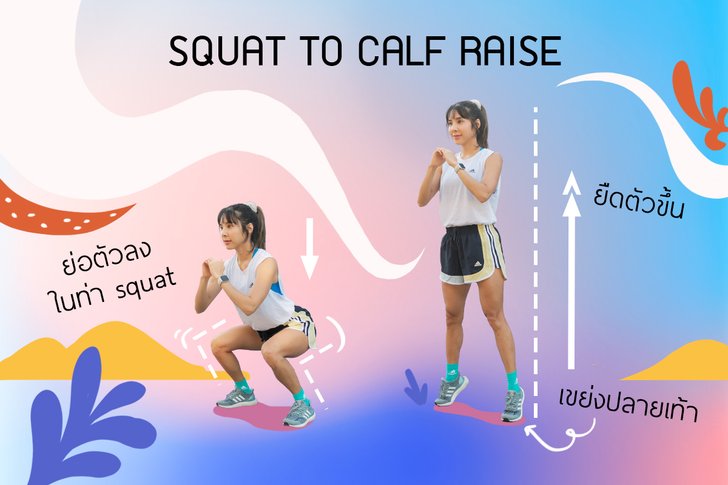 ข้อควรระวัง: เมื่อย่อลงไปในท่า Squat ควรใช้วิธีการเกร็งต้นขาและเปิดเข่าออก ให้เข่าขนานกันกับนิ้วเท้า และไม่ควรให้เข่าหันออกไปด้านข้างมากจนเกินไป รวมถึงการเกร็งน่องขณะที่เขย่งปลายเท้าขึ้นมา