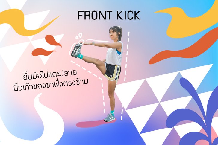 วิธีการทำท่า: ยืนตรงในท่าเตรียมพร้อม ก่อนเตะขาไปด้านหน้าพร้อมกระดกปลายเท้าขึ้น เหยียดเข่าให้ตรงเท่าที่สามารถทำได้ พร้อมยื่นปลายนิ้วมือฝั่งตรงข้ามกับขาไปแตะปลายนิ้วเท้า ทำซ้ำสลับกันไปมาทั้งขาซ้ายและขาขวา