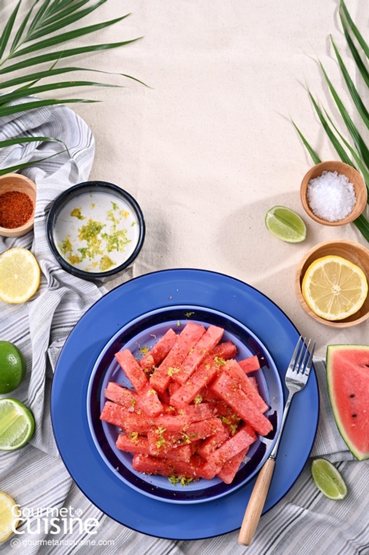 เมนูนี้ทำให้เก๋โดยหั่นแตงโมให้เป็นแท่งยาวเหมือนเฟรนช์ฟรายส์ให้ดูแปลกตา โรยพริกเกลือ ผิวมะนาว ผิวเลมอน ให้รสเข้มข้นและสดชื่นขึ้น แล้วหยิบแตงโมดิปกับโยเกิร์ตมะพร้าว ดูแปลก ชวนกิน กินเพลิน คลายร้อนสดชื่น อารมณ์ดีจนไม่ต้องบ่นว่าร้อน
